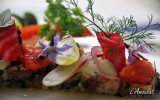 Le Chef vous propose sa cuisine élaborée et personnalisée au rythme du marché : « Du tartare de veau aux crevettes et pomelos à la poêlée de ris d'agneau aux artichauts, caramel au vinaigre de framboise passez au suprême de poulet fermier aux cèpes ou à la noisette de porc aux fruits de saison...terminez par une douceur comme la raviole d'ananas aux fruits exotiques ou le sablé fraise/citron ».