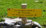 À la sortie de celle-ci, après un passage escarpé, monter à droite dans une prairie. Traverser une piste et continuer à monter. Au niveau de la cabane de Coste de Goua, qui se tient sur la rive opposée à droite, suivre le chemin qui monte dans le vallon. Laisser sur votre gauche une piste qui se dirige vers le torrent et continuer à monter sur le sentier raide et caillouteux. Après une petite descente, prendre à droite en direction de la cascade d’Anglas, visible plus haut. Au niveau d’éboulis, à gauche, continuer à monter raide. Sur votre gauche se dresse le Pic du Sanctus culminant à 2482 mètres d'altitude. En haut de la montée, tourner à gauche, passer un gué sur le déversoir du lac. Sur votre droite vous apercevez les aiguilles du Pene Sarrière avec ses différentes voies d’escalade.